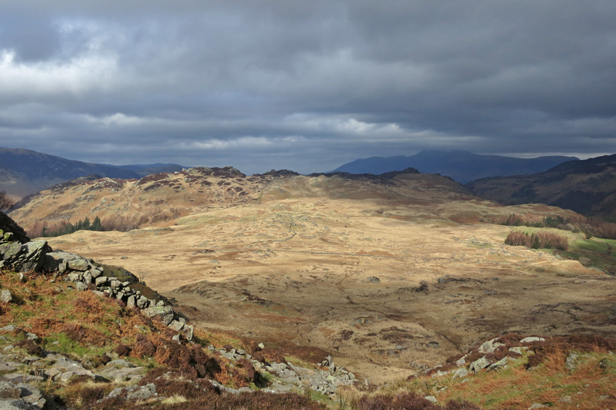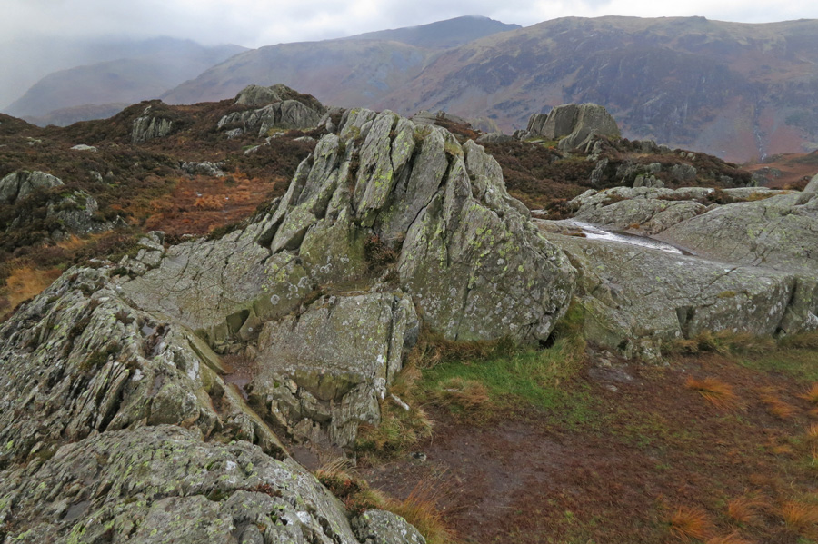 Wainwright's Central Fells guide book published in 1958 states Grange Fell's height as 1,363ft but the OS 1:25,000 map now records 410m (1,345ft). The summit is called Brund Fell.