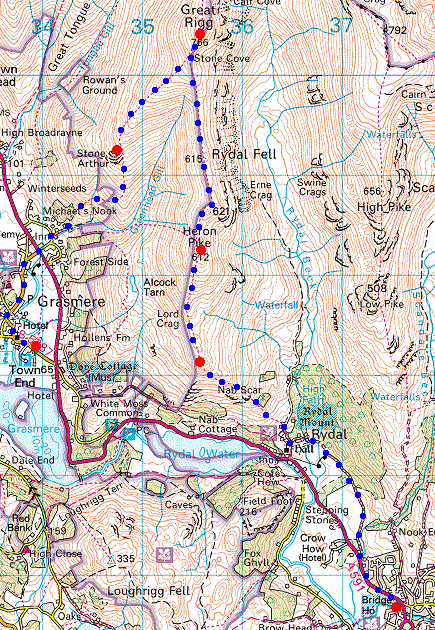 Route: Grasmere Village - Stone Arthur - Great Rigg - Erne Crag top - Heron Pike - Nab Scar - Rydal Park - Ambleside