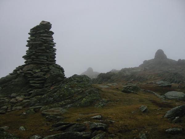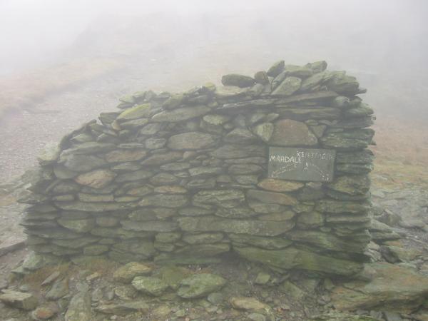 Shelter at Nan Bield Pass with a sign to Mardale and Kentmere