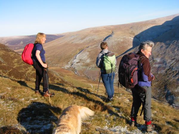 The three Ann(e)'s (Hiley, Leaney and Bowker) on the rim of Lonscale Crags looking down into Glenderaterra valley