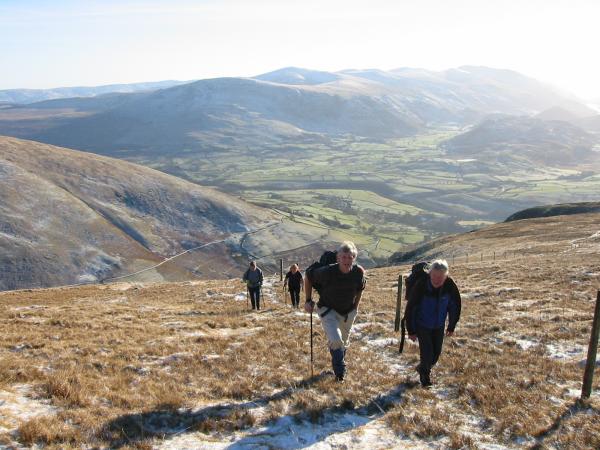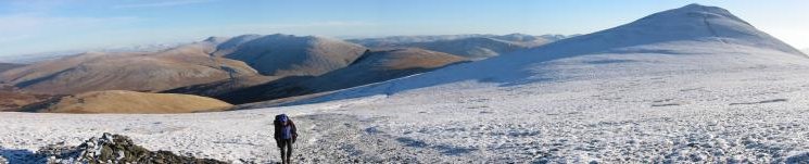 Descending off Skiddaw Little Man with Blencathra and the Helvellyn ridge in the distance