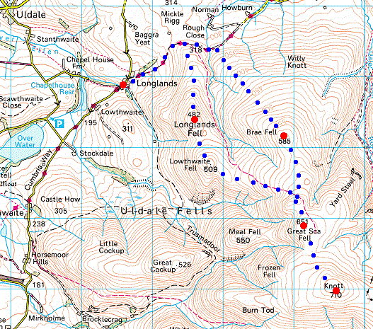 Route: Longlands - Longlands Fell - Lowthwaite Fell - Little Sca Fell - Great Sca Fell - Knott - Great Sca Fell - Little Sca Fell - Brae Fell - Longlands