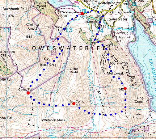 Route: Maggie's Bridge, Loweswater - Kirkstile Inn, Loweswater - Mellbreak (North top) - Mellbreak - Mosedale - Hen Comb - Gavel Fell - High Nook Farm - Maggie's Bridge