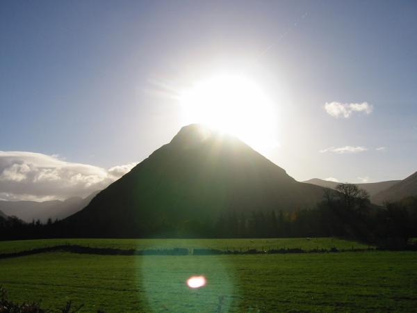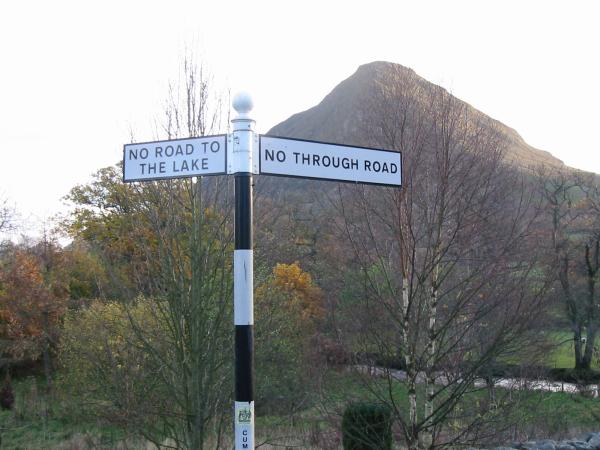 Wainwright's negative signpost at Kirkstile Inn road junction and Mellbreak