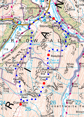Route: Stonethwaite - Big Stanger Gill - Rosthwaite Fell - Bessyboot top - Rosthwaite Fell - Dovenest Crag top - Glaramara - Thornythwaite Fell - Stands Bridge, Seatoller - Stonethwaite