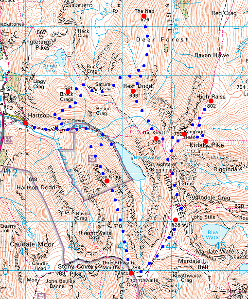 Route: Hartsop - Brock Crags - Satura Crag - The Nab - Rest Dodd - The Knott - Rampsgill Head - High Raise - Kidsty Pike - Straits of Riggindale - High Street - Thornthwaite Crag - Gray Crag - Hayeswater - Hartsop