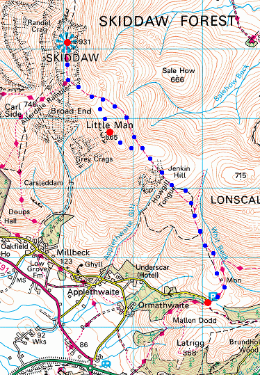 Route: Latrigg car park (end of Gale Road) - Jenkin Hill - Skiddaw Lesser Man - Skiddaw Little Man - Skiddaw - Jenkin Hill - Latrigg car park