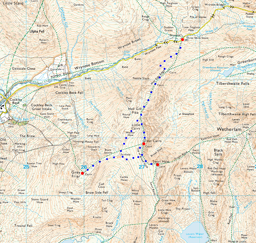 Route: Wrynose Pass - Wet Side Edge - Hell Gill Pike - Little Carrs - Great Carrs - Swirl How - Fairfield - Grey Friar - Fairfield - Wet Side Edge - Wrynose Pass