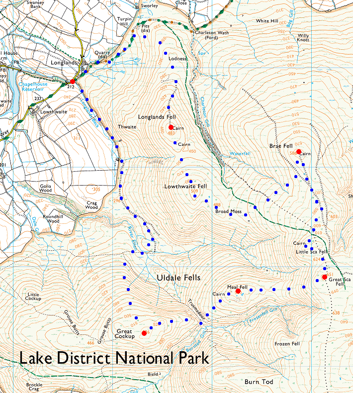 Route: Longlands - Longlands Fell - Lowthwaite Fell - Brae Fell - Little Sca Fell - Great Sca Fell - Meal Fell - Trusmadoor - Great Cockup - Longlands