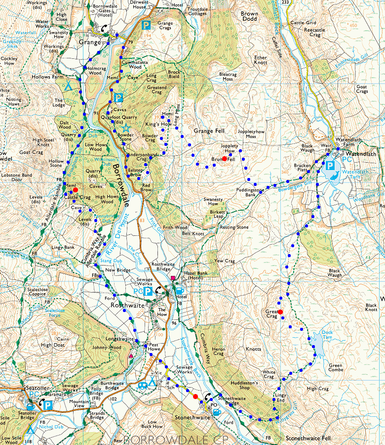 Route: Stonethwaite - Lingy End - Dock Tarn - Great Crag - Watendlath Tarn - Watendlath - Puddingstone Bank - Grange Fell (Brund Fell) - Grange Fell (King's How) - Bowder Stone - road - Grange in Borrowdale - Broadslack Gill - Castle Crag - River Derwent - Longthwaite - Stonethwaite
