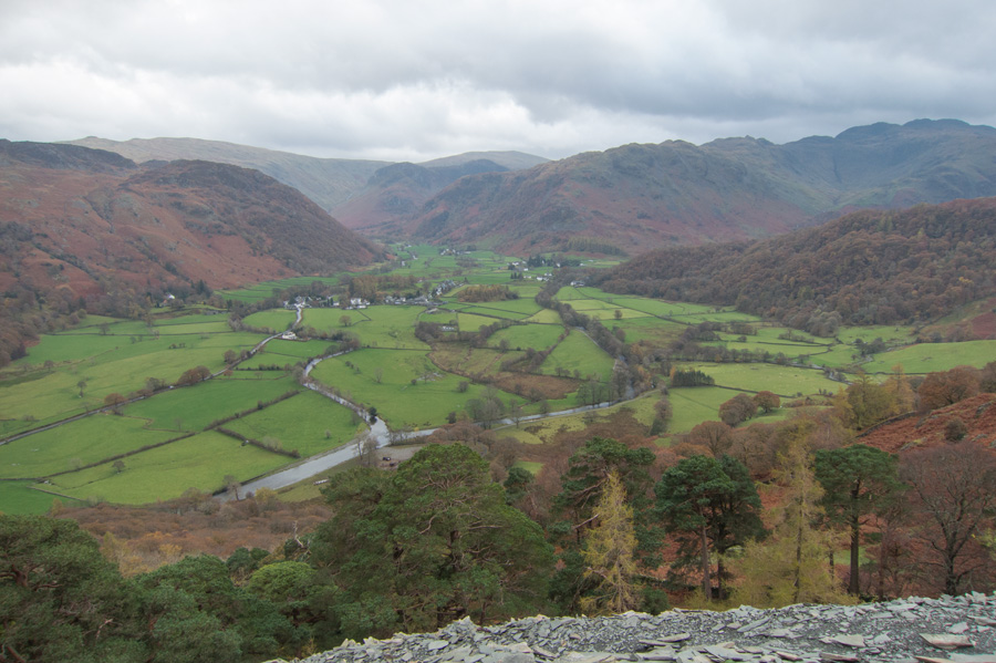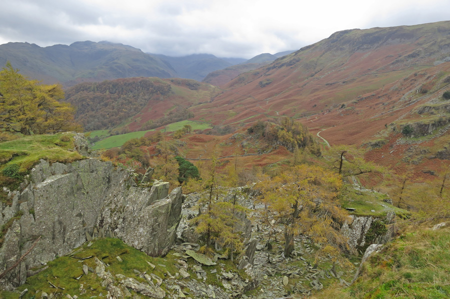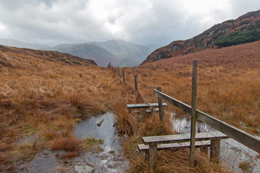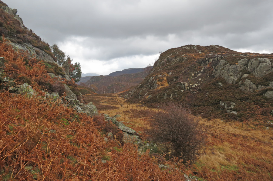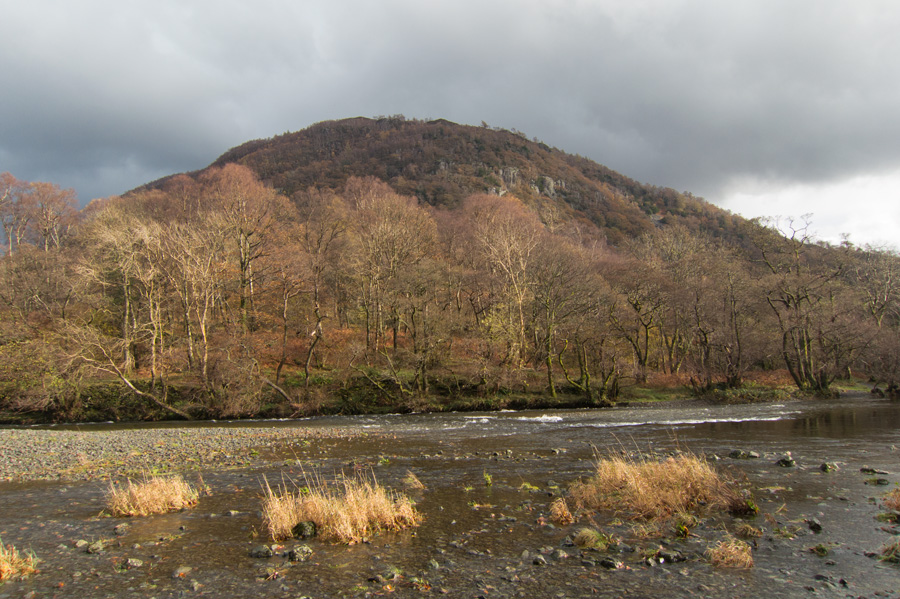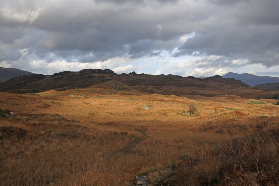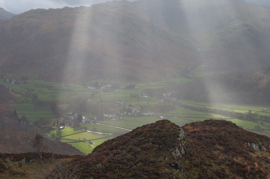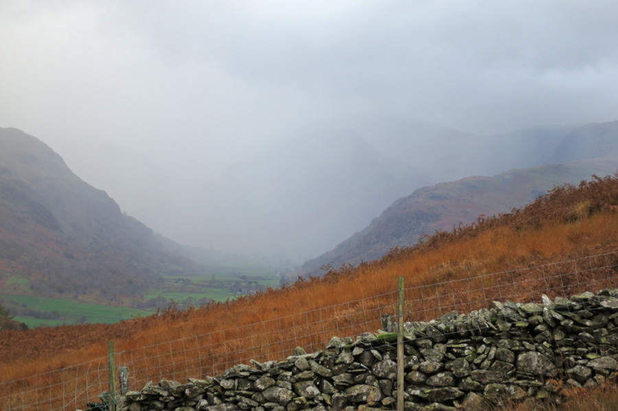 Windy, overcast but some splashes of sun. Heavy rain on Grange Fell down to Grange.