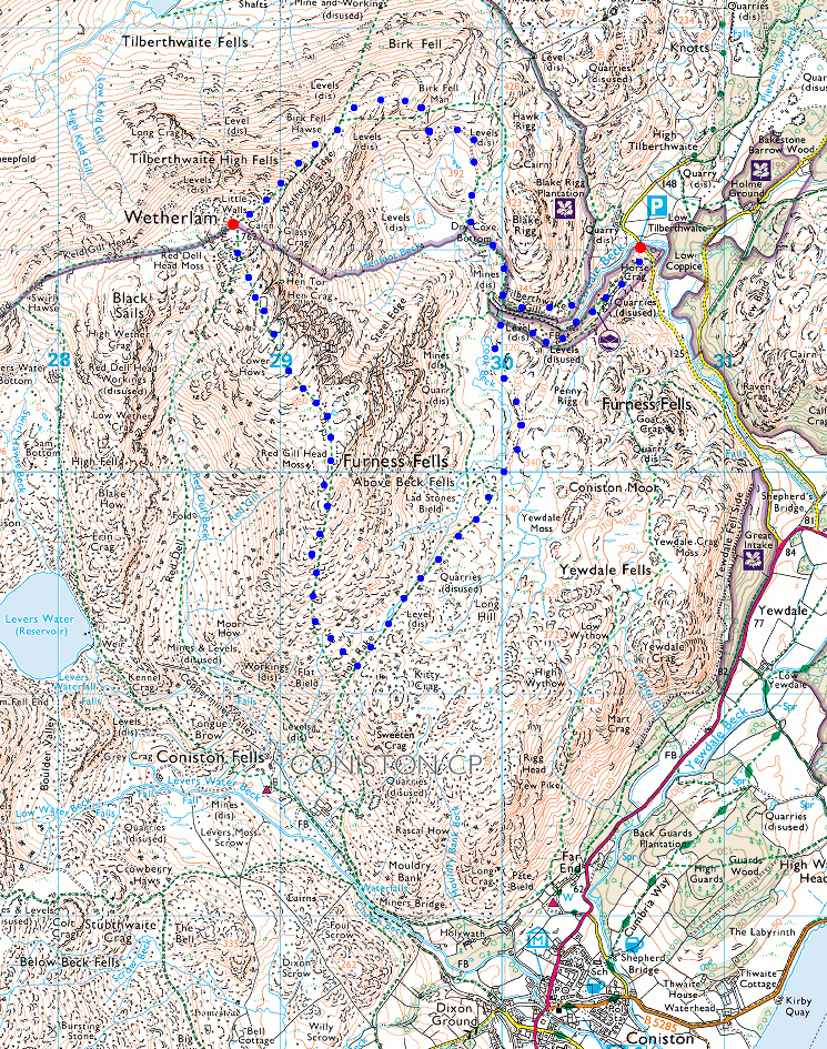 Route: Low Tilberthwaite - Birk Fell Hawse - Wetherlam Edge - Wetherlam - Lad Stones ridge - Hole Rake - Low Tilberthwaite