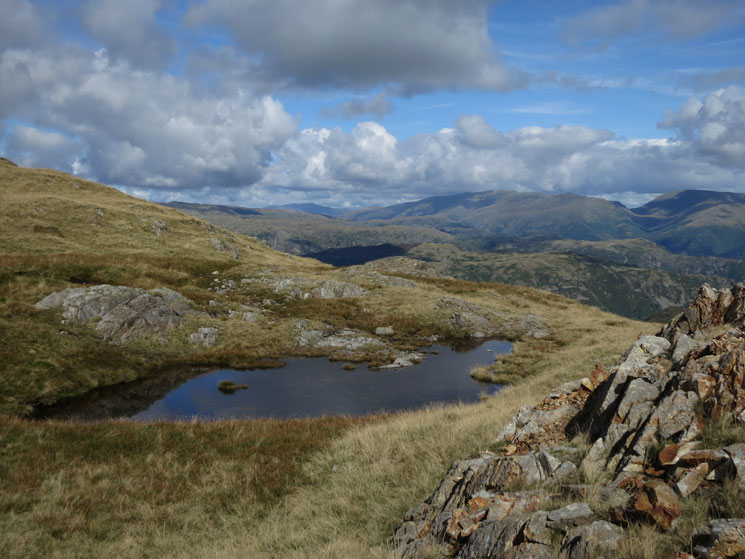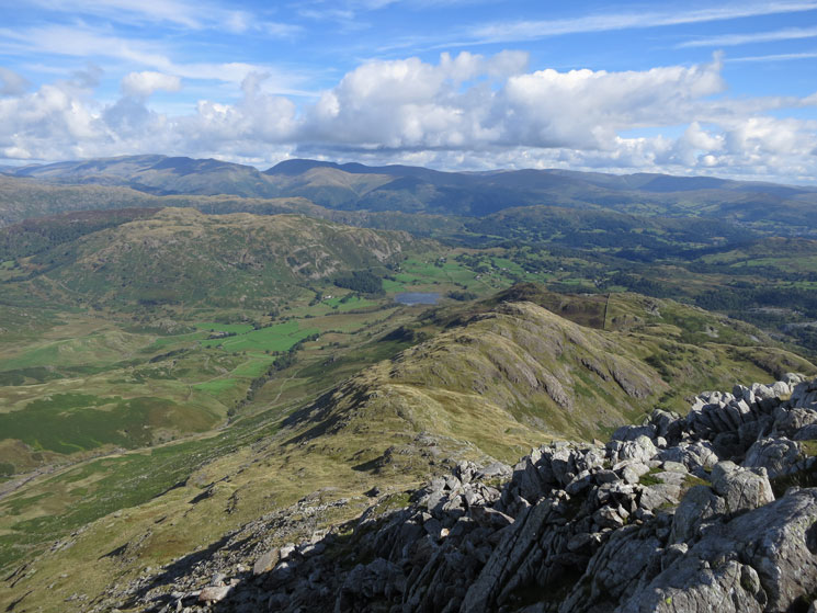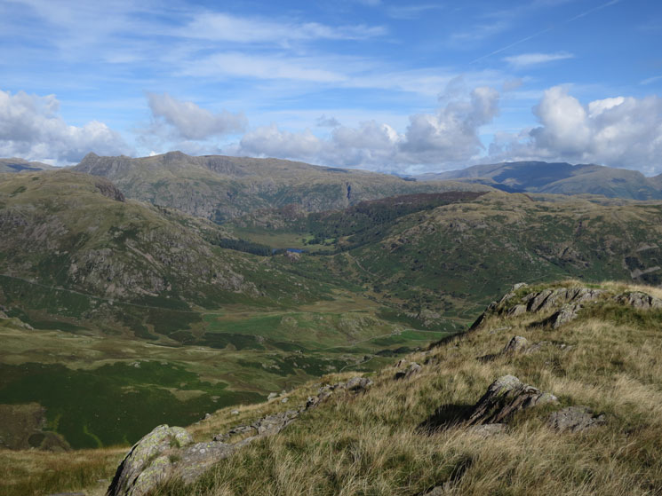 Looking across to the Langdale Pikes, a glimpse of Blea Tarn and the Helvellyn ridge behind Lingmoor Fell