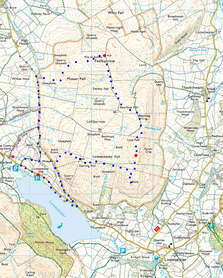 Route: Loweswater car park - old road to Mosser - Fellbarrow - Smithy Fell - Low Fell - Low Fell (south top) - Darling Fell - old road to Mosser - Loweswater - Loweswater car park