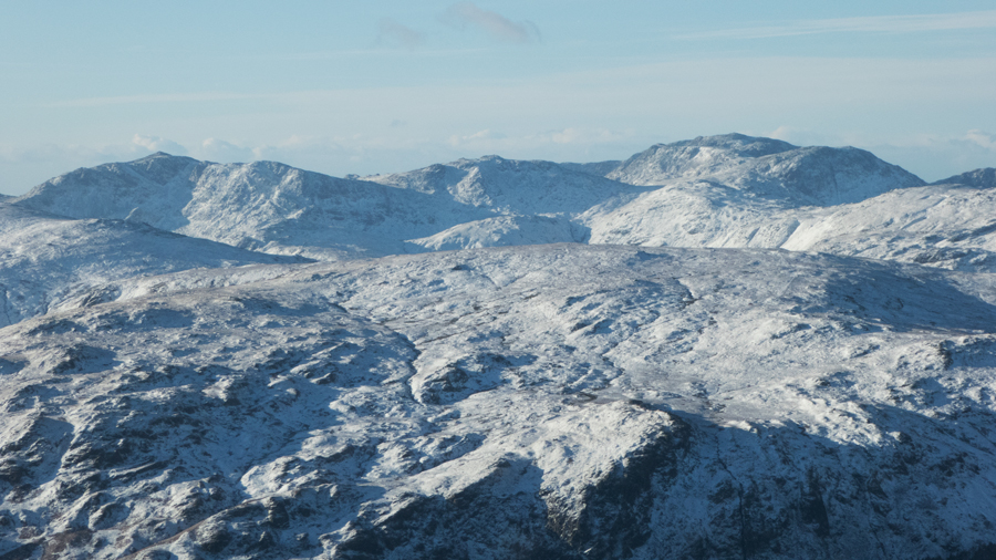 Zooming in on Bowfell, Esk Pike and Scafell Pike