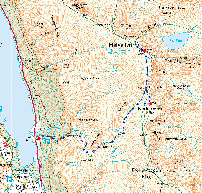 Route: Wythburn - Comb Gill - Birk Side - Swallow Scarth - Helvellyn - Swallow Scarth- Nethermost Pike - Birk Side - Comb Gill - Wythburn