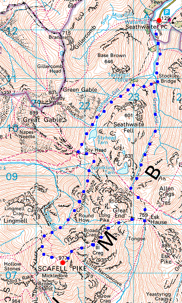 Route: Seathwaite, Borrowdale - Stockley Bridge - Grains Gill - Esk Hause - Calf Cove - Broad Crag Col - Scafell Pike - Corridor Route - Sty Head - Styhead Tarn - Styhead Gill - Stockley Bridge - Seathwaite