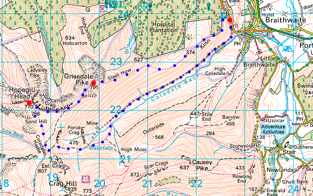 Route: Braithwaite - Kinn - Sleet How - Grisedale Pike - Hopegill Head - Sand Hill - Coledale Hause - Force Crag Mine - Coledale - Braithwaite