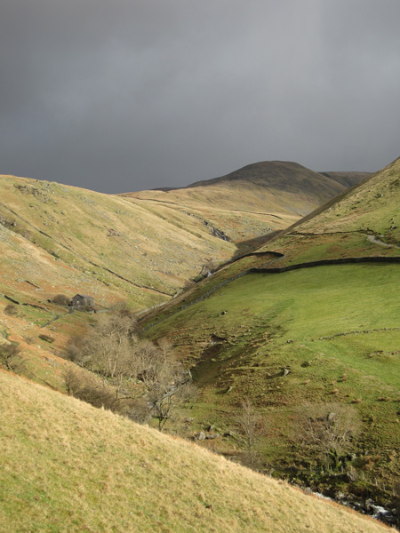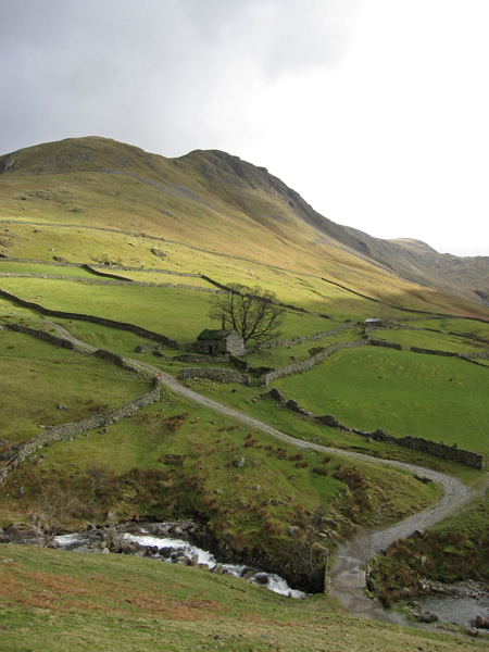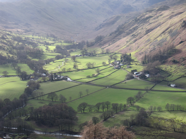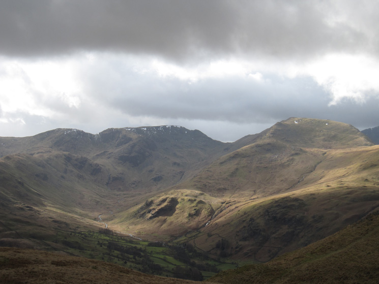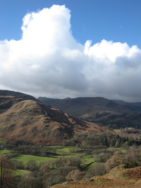 Sunshine on Arnison Crag and the pointed tops of High Spying How and Catstycam on the skyline