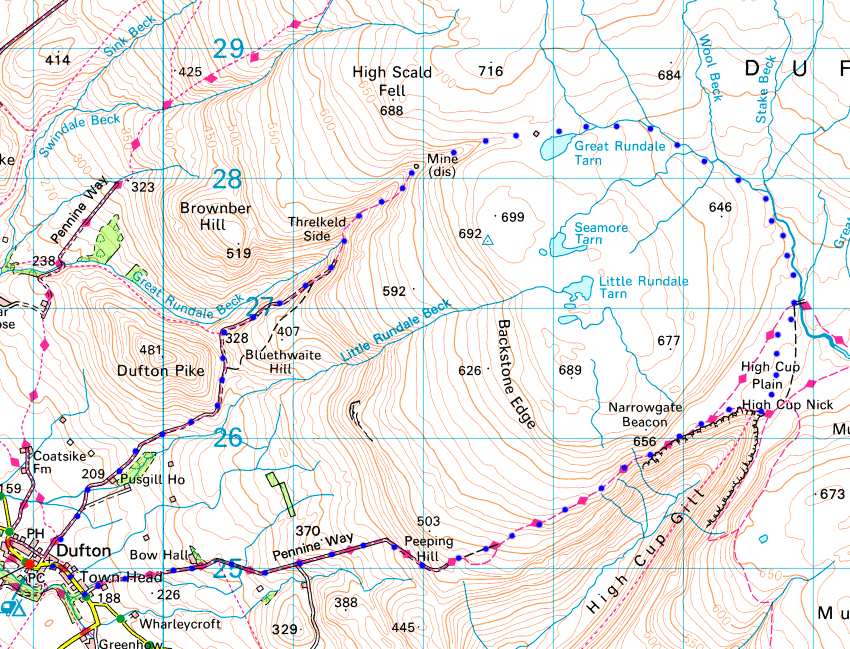 Route: Dufton - Threlkeld Side - Shooting Box - Great Rundale Tarn - Tarn Sike - Maize Beck - High Cup Nick - Pennine Way - Dufton