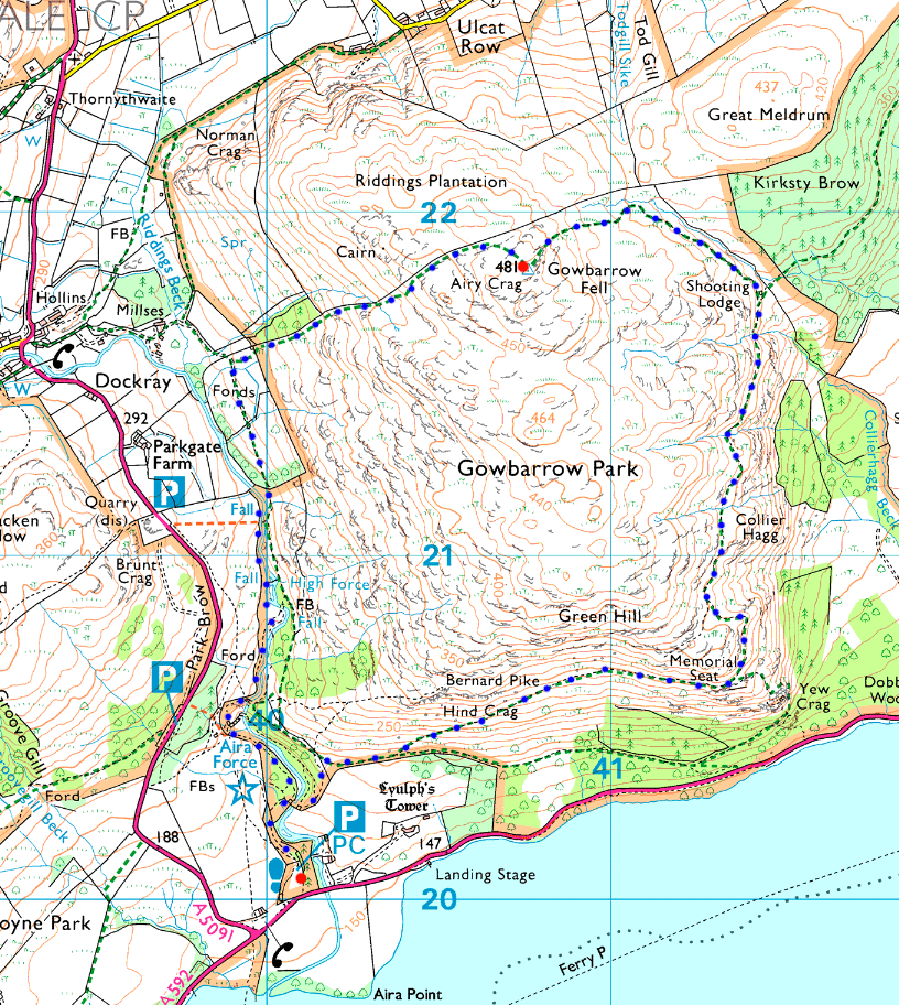 Route: Aira Force bottom carpark - Aira Force - High Force - Gowbarrow Fell - shooting lodge - traverse above Yew Crag - carpark