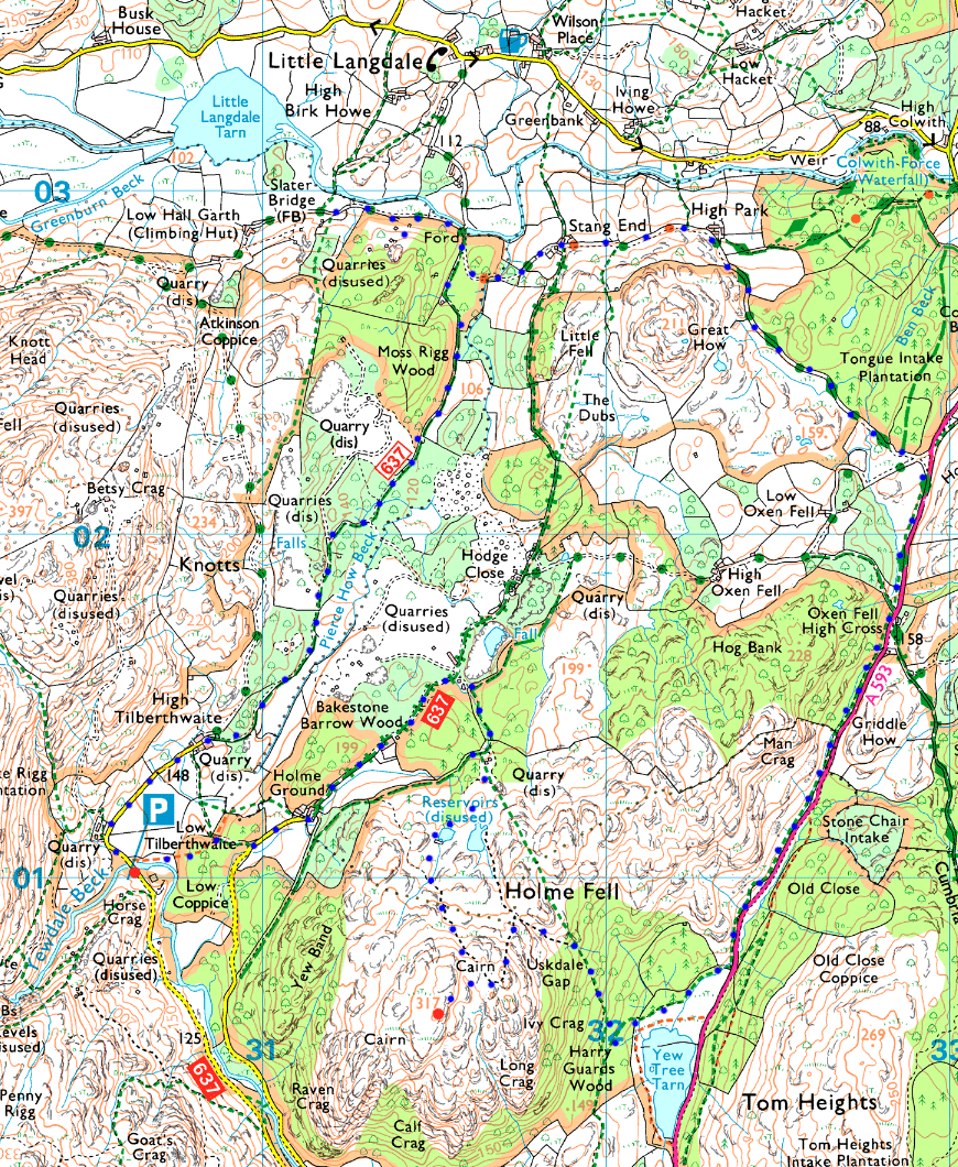 Route: Low Tilberthwaite - Hodge Close - Holme Ground Tarns - Holme Fell - Ivy Crag - Uskdale Gap - Harry Guards Wood - Yew Tree Tarn - Oxen Fell High Cross - High Park - Stang End - Cathedral Quarry - Slater Bridge - High Tilberthwaite - Low Tilberthwaite