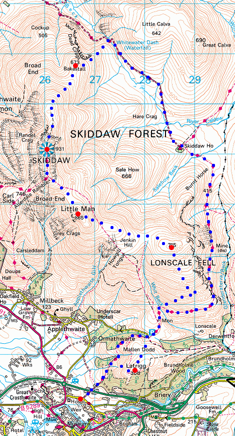 Route: Briar Rigg, Keswick - Latrigg car park (end of Gale Road) - Lonscale Fell - Jenkin Hill - Skiddaw Lesser Man - Skiddaw Little Man - Skiddaw - Bakestall - Birkett Edge - Cumbria Way - Skiddaw House - Glenderaterra valley - Latrigg car park - Latrigg - Briar Rigg