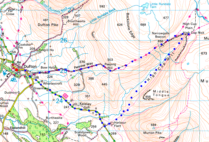 Route: Dufton - road - Harbour Flatt - High Cup Gill - High Cup Nick - Pennine Way - Dufton