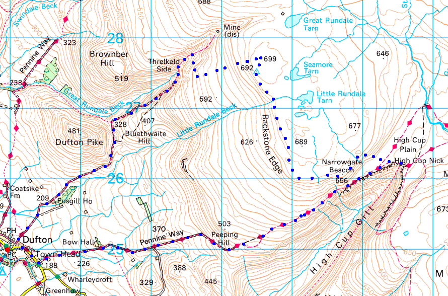 Route: Dufton - Threlkeld Side - Dufton Fell - Trig 692m - Backstone Edge - Narrowgate Beacon - High Cup Nick - Pennine Way - Dufton