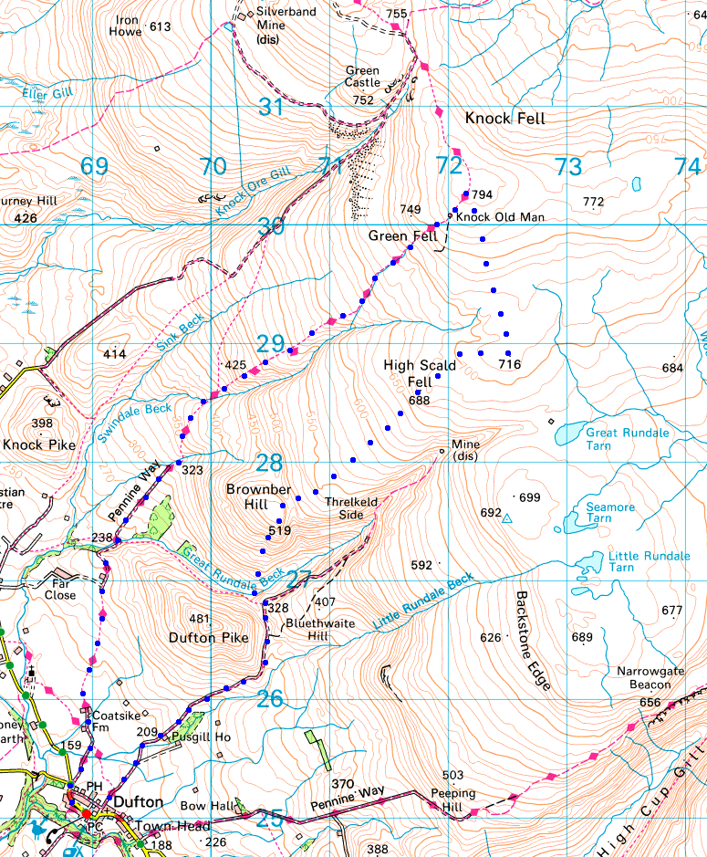 Route: Dufton - High Scald Fell track - Brownber Hill - Rossgill Edge - Low Scald Fell - High Scald Fell - Swindale Head - Knock Fell - Knock Old Man - Knock Hush - Swindale Beck - Pennine Way - Halsteads - Hurning Lane - Coatsike - Dufton