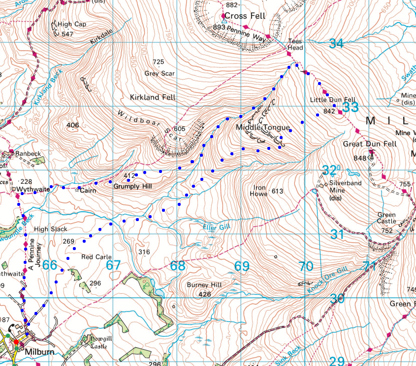 Route: Milburn - Blea Crag - Little Dun Fell - Tees Head - Green Pot - Crowdundle Beck - Greatdale - Grumply Hill - Wythwaite - Milburn