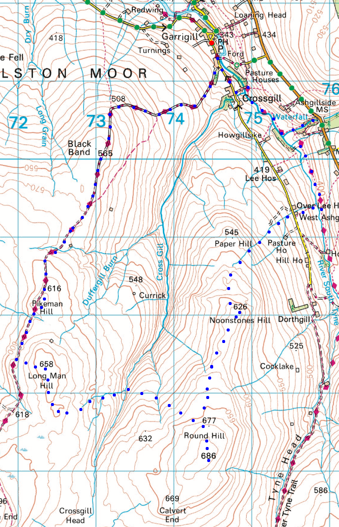 Route: Garrigill - Pennine Way - Pikeman Hill - Long Man Hill - Round Hill - Noonstones Hill - River South Tyne - Ashgill Force - Garrigill