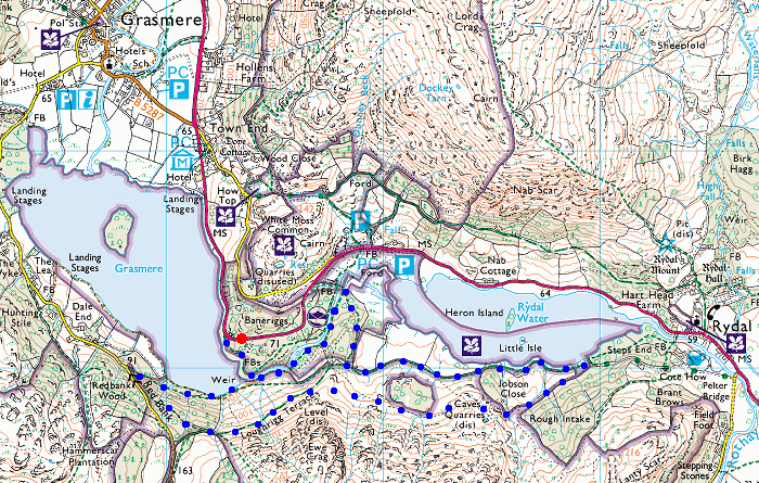 Route: White Moss Common - Grasmere - Deerbolts Wood - Loughrigg Terrace - Loughrigg Cave - Rydal Water - White Moss Common