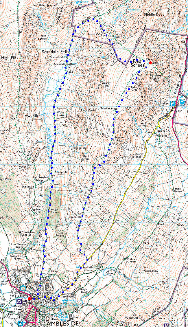 Route: Ambleside - Kirkstone Road - south Ridge - Snarker Pike - Red Screes Tarn - Red Screes - Scandale Pass - Scandale - High Sweden Bridge - Ambleside