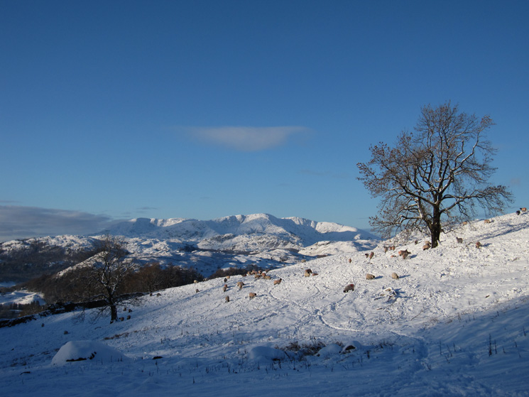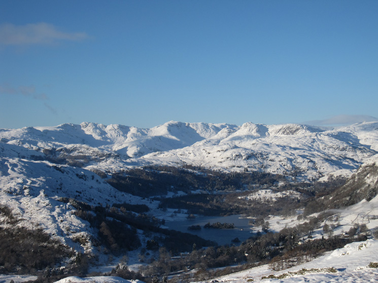 The Langdale Fells, Bowfell centre, with Rydal Water below