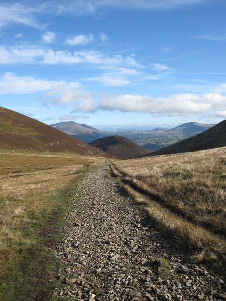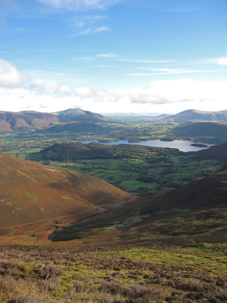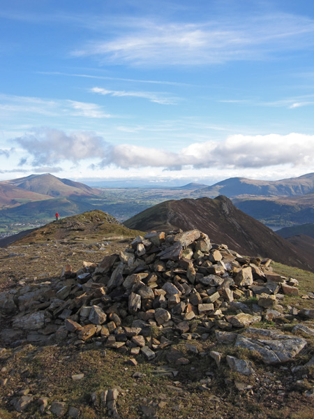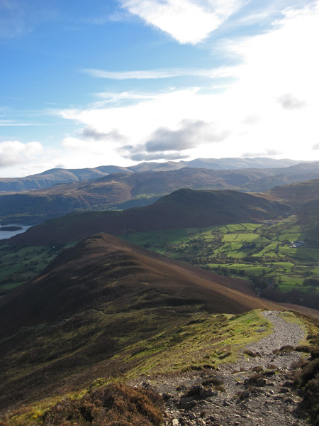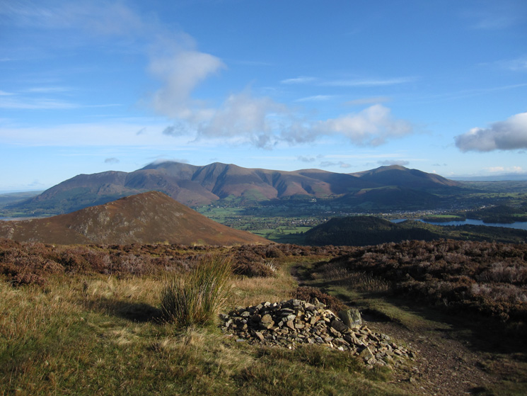 Rowling End below, Catbells, the central ridge and the Helvellyn range from Causey Pike