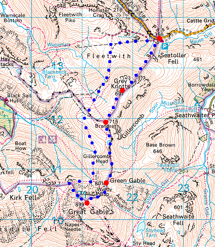 Route: Honister Pass - Drum House - Moses' Trod - Beck Head - Great Gable - Windy Gap - Green Gable - Gillercomb Head - Gillercomb Head Tarns - Brandreth - Grey Knotts Tarns - Grey Knotts - Honister Pass