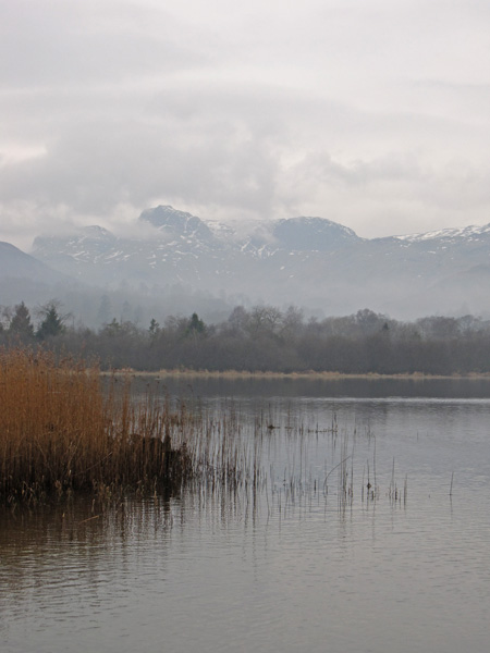 Looking across Elter Water to the Langdale Pikes