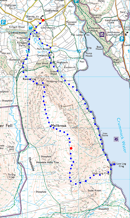 Route: Loweswater Village - Mellbreak (northern top) - Mellbreak - Low Ling Crag - Crummock Water - Lowpark - Loweswater Village