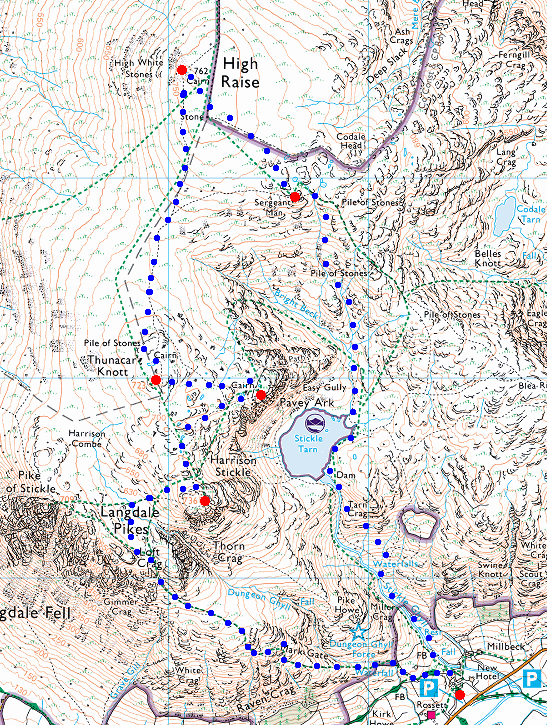 Route: Stickle Barn, Great Langdale - Stickle Ghyll (Mill Gill) - Stickle Tarn - Sergeant Man - High Raise - Thunacar Knott - Pavey Ark - Harrison Stickle - Harrison Combe - Mark Gate - Stickle Barn
