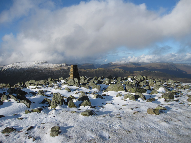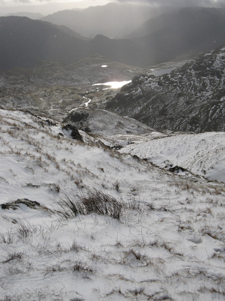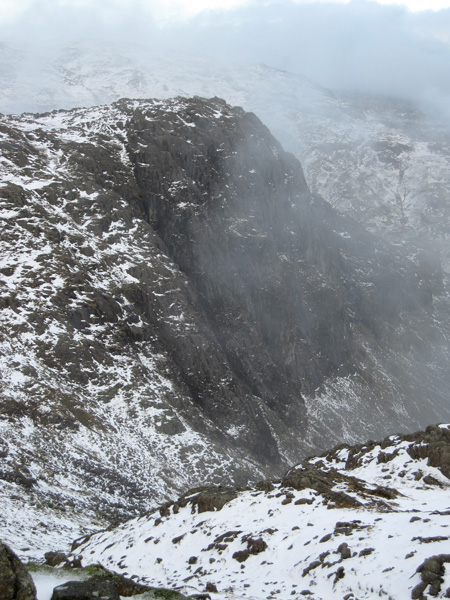 Snow on Glaramara on the left but none on High Spy on the right from High Raise