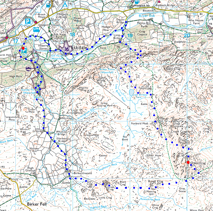 Route: Dalegarth Hall - Stanley Force - Birkerthwaite - Great Crag - Green Crag - Low Birker Tarn - Low Birker - Doctor Bridge - River Esk - St Catherine's Church - Dalegarth Hall