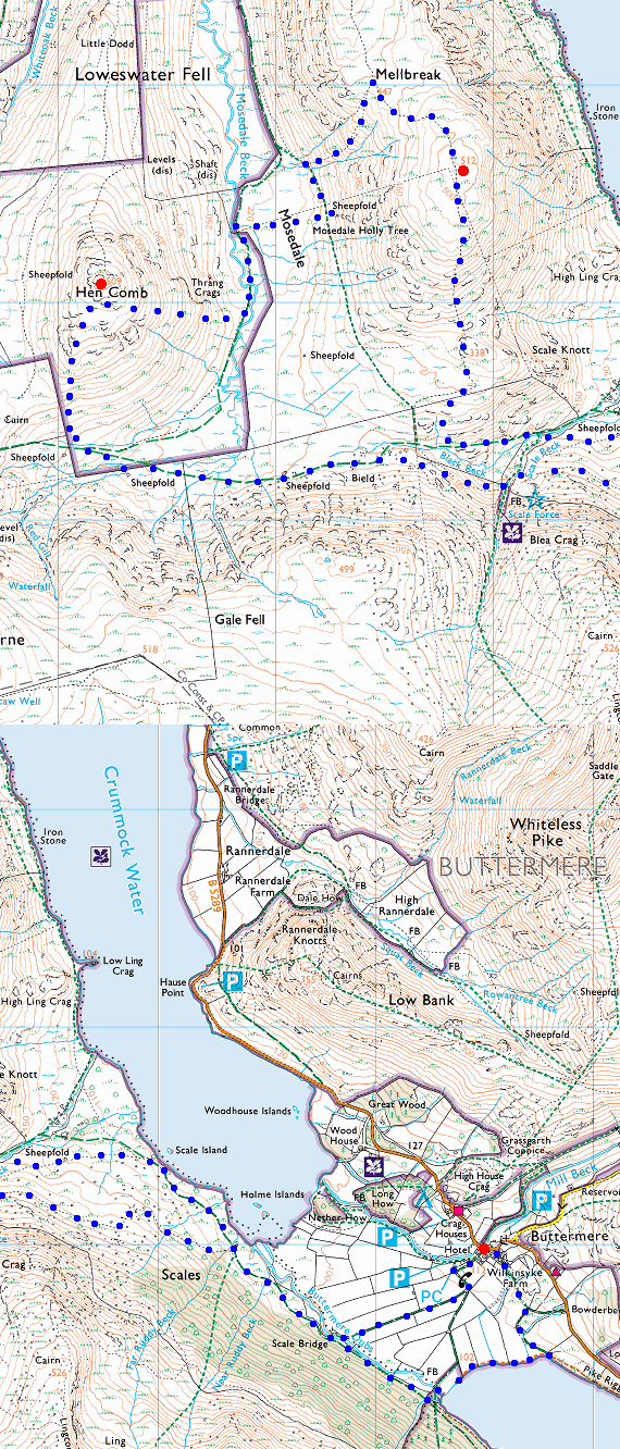 Route: Buttermere Village - Scale Knott - Mellbreak - Mosedale - Hen Comb - Scale Force - Buttermere - Buttermere Village