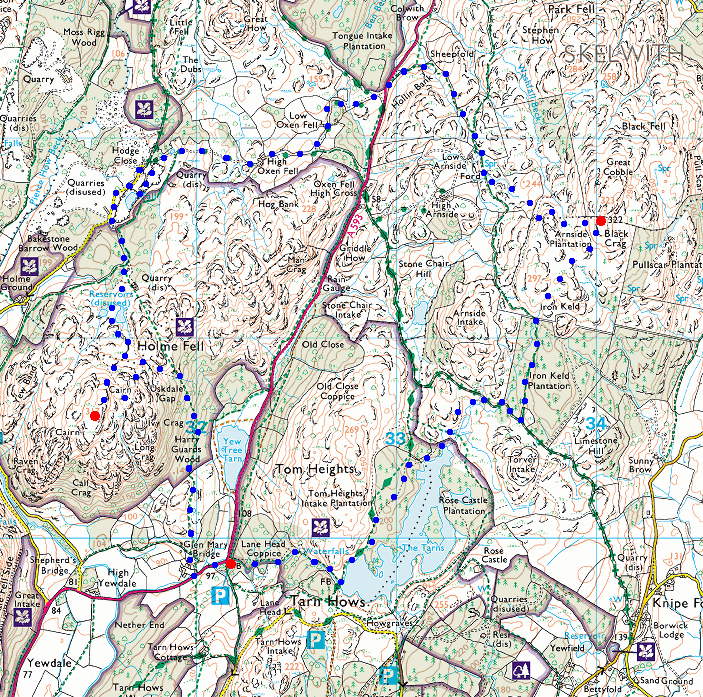 Route: Glen Mary Bridge - Tom Gill Waterfall - Tarn Hows - Iron Keld Plantation - Black Fell (Black Crag) - Low Arnside - Hollin Bank - Tongue Intake - Low Oxen Fell - High Oxen Fell - Hodge Close - Holme Ground Tarns - Holme Fell - Ivy Crag - Uskdale Gap - Harry Guards Wood - Yew Tree Farm - Glen Mary Bridge