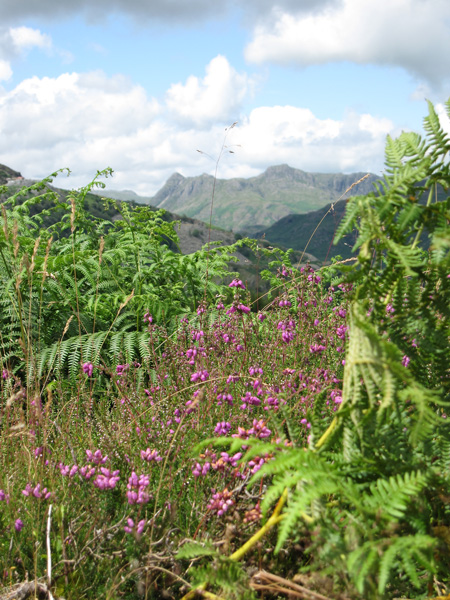 The heather is starting to come out on Holme Fell, the Langdale Pikes in the distance