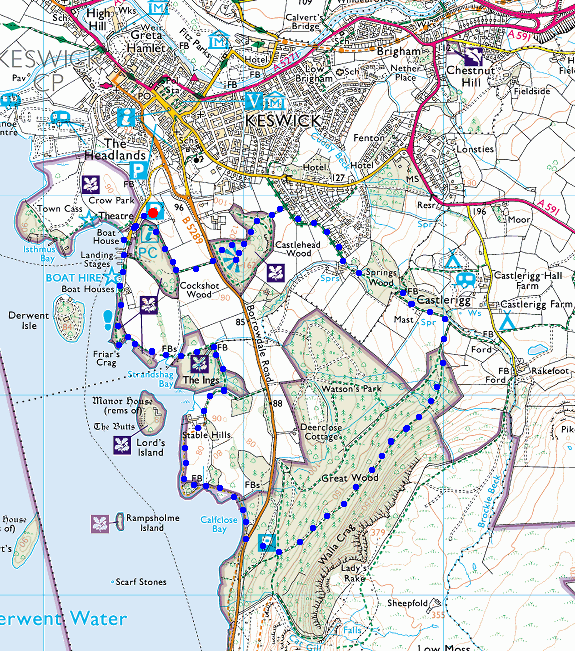 Route: The Theatre by the Lake, Keswick - Castle Head - Springs Farm - Great Wood - Derwent Water - Friar's Crag - The Theatre by the Lake