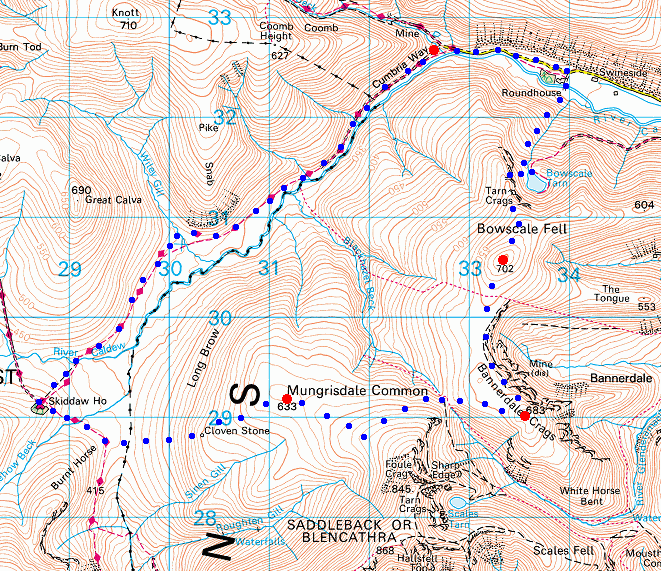 Route: Grainsgill Beck Bridge - Roundhouse - Bowscale Tarn - Bowscale Fell - Bannerdale Crags - Glenderamackin Col - Mungrisdale Common - The Stake - Skiddaw House - Cumbria Way - Grainsgill Beck Bridge