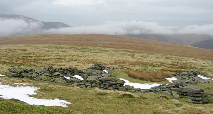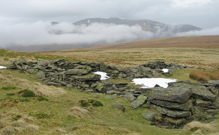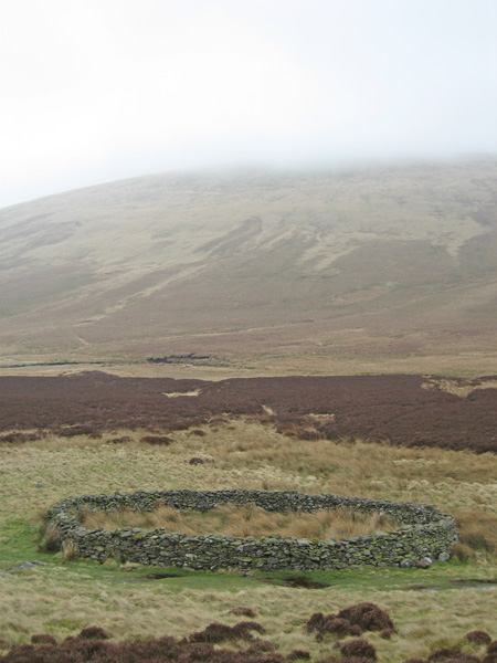 Circular sheepfold (NY296301) with the top of Mungrisdale Common now in cloud