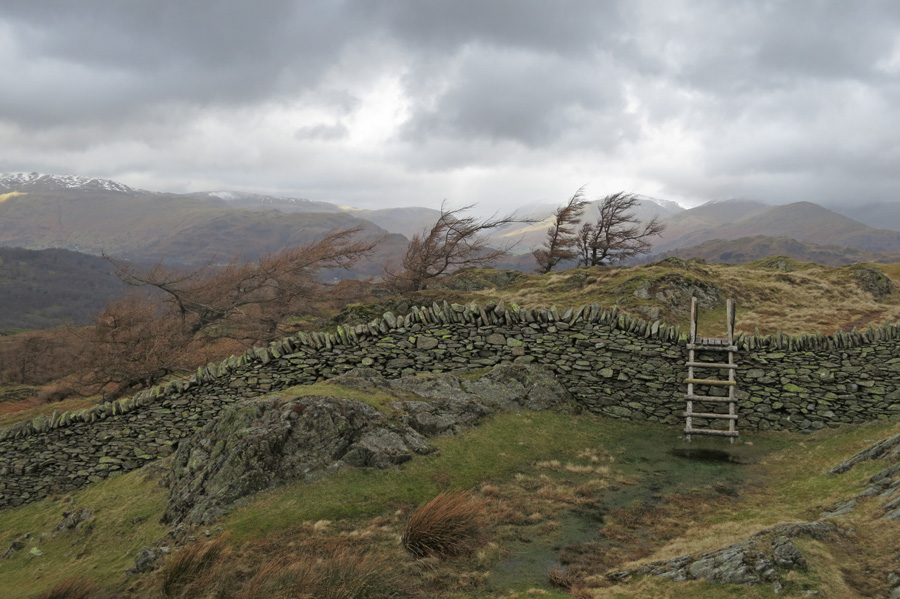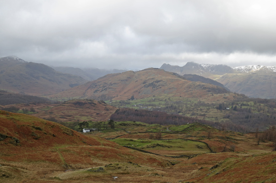 Lingmoor Fell in the middle with the Langdale Pikes behind. The white building is Low Arnside
