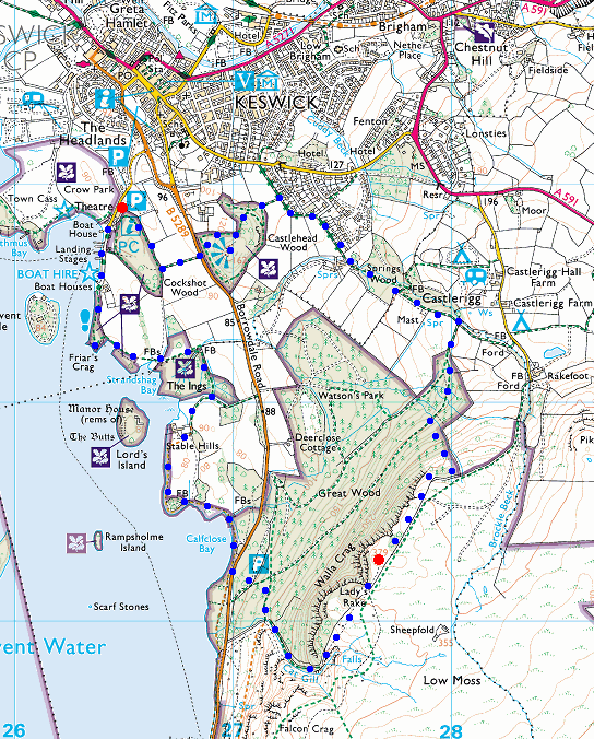 Route: The Theatre by the Lake, Keswick - Castle Head - Springs Farm - Great Wood - Walla Crag - Cat Gill - Derwent Water - Friar's Crag - The Theatre by the Lake